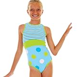 Patsy Aiken Designs , Turquoise and white yarn-dye stripe lycra yoke is paired with silky aqua multi jumbo dot tactel and a solid lime inset to make a leotard that she'll flip for! Dotty empire tank leo is fully lined and features a unique criss-cross strap back for that extra stay-put factor! ...