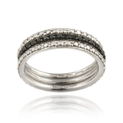 SilverSpeck.com , These stackable rings features a black rhodium plated sterling silver dotted pave band and two additional bands of rhodium plated sterling silver, with dotted pave detailing. This design gives the allusion of shimmering black and white stones. One black diamond is set in the midst of the black design. The rings are crafted of sterling silver. Total diamond weight: .01ct.