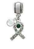 Silver Scroll Ribbon with Emerald Green Swarovski Crystal Charm European Charm Bead Hanger with Clear Swarovski Crystal Drop